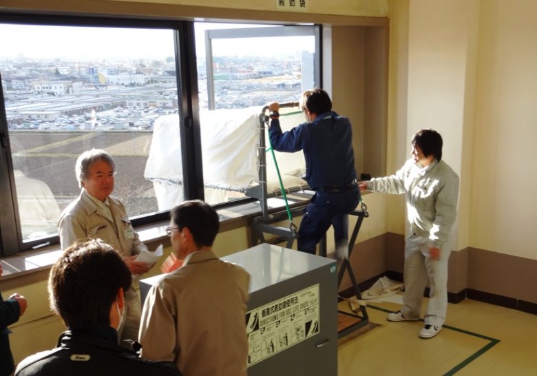 訓練では「病院棟3階西側付近から火災が発生し、5階に2名逃げ遅れた者がいる」という想定に基づき、119番通報、患者さんの避難誘導、救助袋による避難訓練、消防設備の取り扱い、消火器による消火訓練等を行いました。